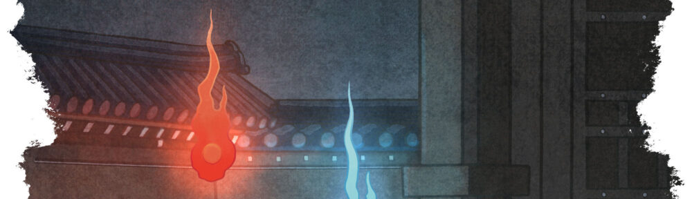 This took place during the previous year of the monkey. A teahouse proprietor working along the horse road had business in Fukagawa, and as night fell he was passing Reigan-ji Temple. At that moment, he saw two ghostly fires – one red, one blue –  but they vanished in an instant. He was a courageous man, so he walked on to the end of the temple without a thought. Then, a young woman’s voice called out to him, so he turned back.