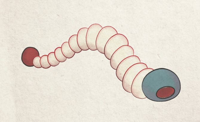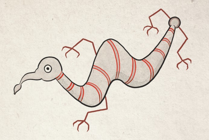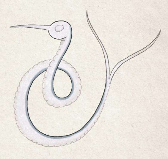 This creepy looking fellow is called kutsuchi no mushi, and it lives in your lungs. It has a bird-like beak on its head and sinister white eyes. Its belly is white and segmented like a snakes, and it has a blueish band running down its back. Its tail is bifurcated.