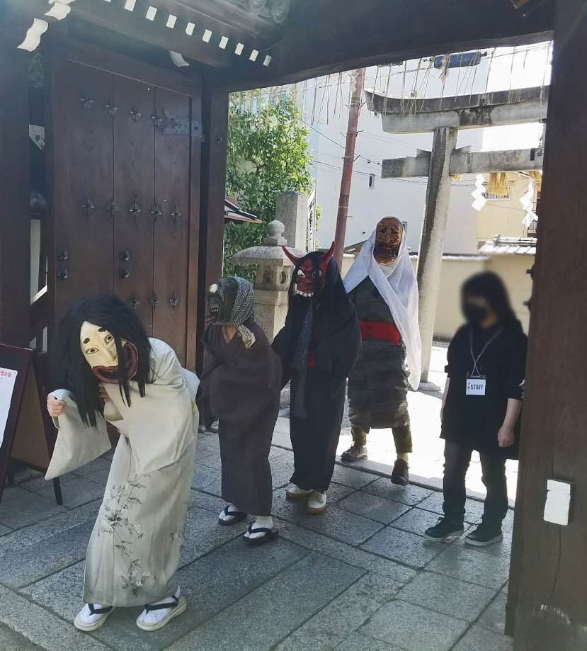 Mononoke Ichi is organized by Hyakuyobako, a yokai art group run by Kono Junya, a professor at Kyoto Saga University of Arts. The first thing that greets you at the festival are Kono’s yokai masks, which are sometimes worn by art students who parade around the festival dressed as yokai. Several of these masks are currently on display in the Museum of International Folk Art in Santa Fe, New Mexico, while the rest are here at the festival. This year, to prevent crowding, only a limited number of yokai were parading around. However, they leave a very strong impression!